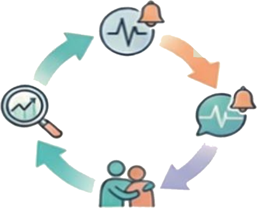 Monitoramento evolutivo ativo. Ajustes proativos e orientação contínua de enfermagem/psicologia.